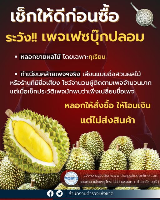 เช็กสักนิดก่อนซื้อ สายทุเรียน ต้องรู้! ระวังเสียเงินฟรี . จากข้อมูลการรับแจ้งความออนไลน์ ของสำนักงาน