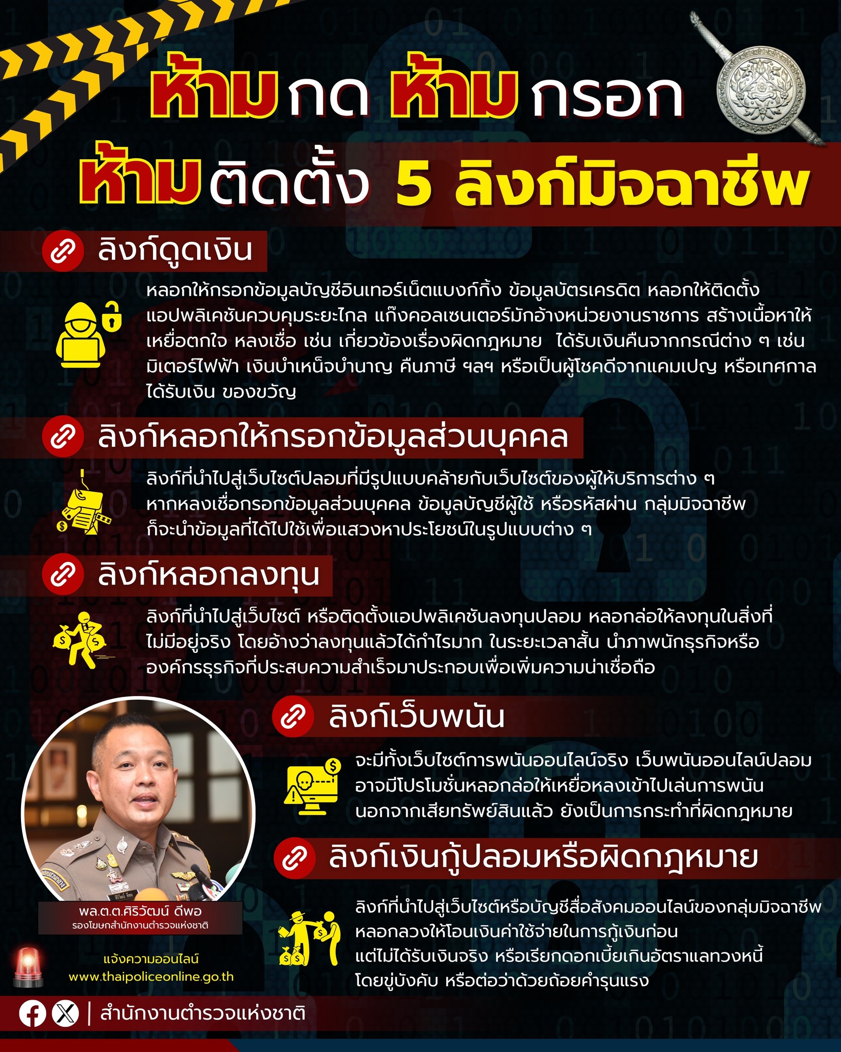 ห้ามกด ห้ามกรอก ห้ามติดตั้ง5 ลิงก์มิจฉาชีพ อันตรายหลอกดูดเงิน ล้วงข้อมูล.พล.ต.ต.ศิริวัฒน์ ดีพอ รองโฆ