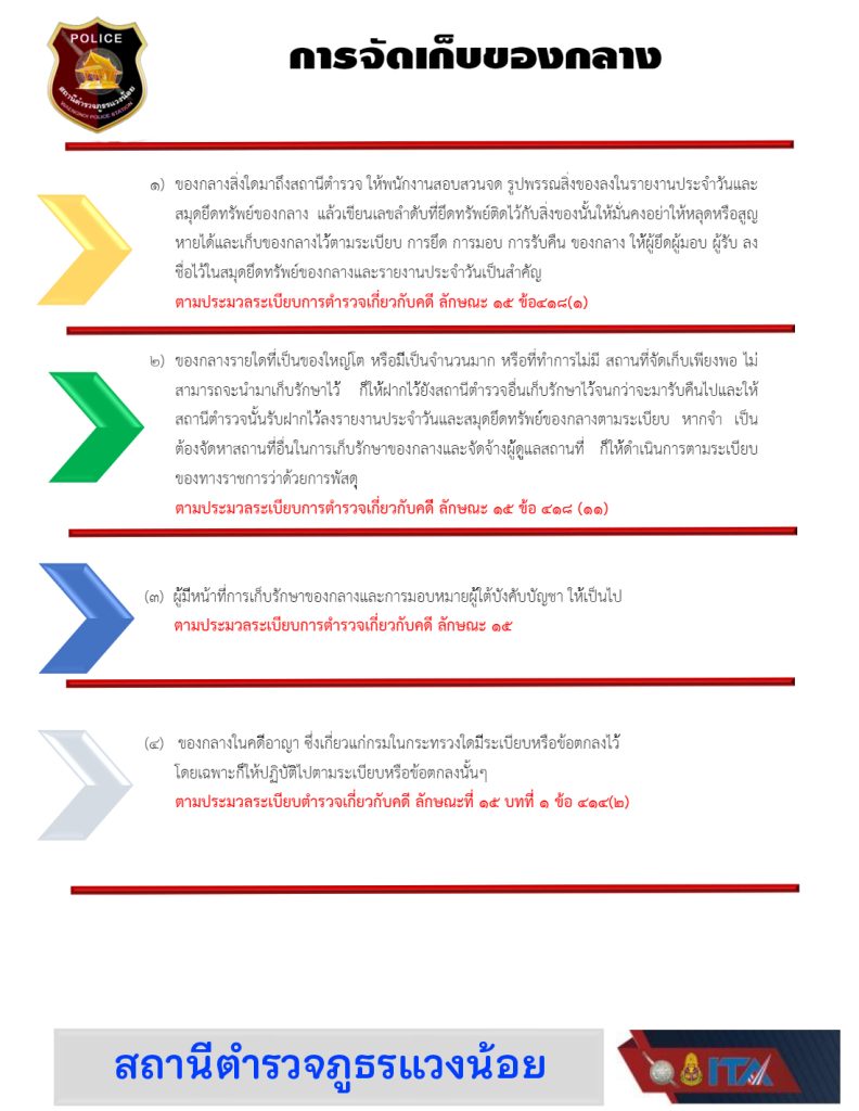 ๔. แนวทางการใช้ของบริจาคแนวทางการจัดเก็บของกลาง แนวทางการจัดเก็บสำนวนการสอบสวนคดีอาญาและคดีจราจร ต้องปฏิบัติตามระเบียบที่กำหนด